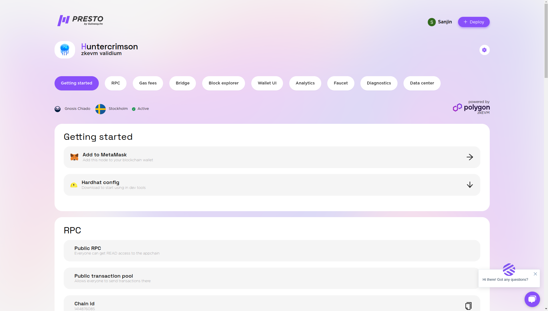 Here you can add your chain to a wallet ([How to use MetaMask with Presto](https://docs-presto.gateway.fm/overview/main-functionality/how-to-use-metamask-with-presto)) and also download the config for Hardhat to deploy smart contracts ([How to use HardHat with Presto](https://docs-presto.gateway.fm/overview/features-for-developers/how-to-use-hardhat-with-presto)).